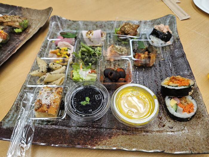 写真に写っているプチおむすびとキンパは、ご飯ものがお寿司1貫のみだったため、少し物足りないかもしれないと思い、近くのお店で追加したものです。別途オプションでおにぎりやおいなりさん、サンドイッチなどを追加できると、量の調整ができてより使いやすいと思いました。