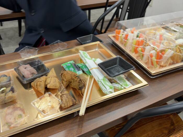 味・見た目ともに素晴らしく、参加者からも大好評。お料理はひとつずつカップ分けされているので、取り分けやすく、懇親会の場にとても向いていると感じました。特にお酒好きな方からは「お酒によく合う」と喜ばれていました。