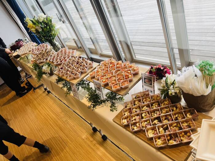 彩り豊かで手に取りやすいフィンガーフードでした。お肉から野菜まで多様なメニューで参加された方の好みに合わせて食べていただけました。小分けしてあるため、立食でも食べやすかったです。