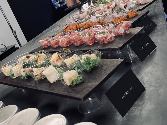 小分けのオシャレオードブルを囲んで、立食パーテ...