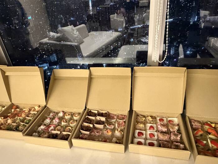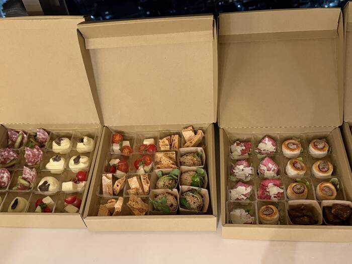 当店では団体向けのパーティーシーンでお取り分けしやすいよう、お一人様ずつ小分けカップにお詰めしてお届けします。また外装容器はしっかりとしたオリジナルのクラフトボックスをご用意しました。お料理を広げやすいよう、蓋には切り取り線を入れておりますので、会場でお料理の配置などのご準備もスムーズです。