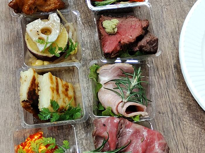 当店では熟成した黒毛和牛のみを使用。肉の専門家が選び抜いた1等買いした黒毛和牛のランプ、イチボ、ハラミのほか希少部位を、肉寿司、ローストビーフ、生ハムなど、最も美味しく味わえる調理法で提供。さらに、和洋折衷の創作サイドメニューが、熟成肉の旨味を一層引き立て、バラエティ豊かな美食の饗宴を演出します。