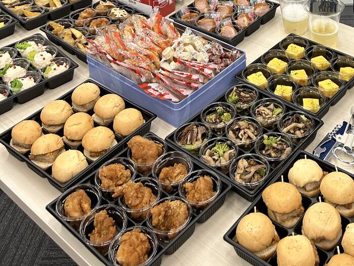 総勢25人での会社の懇親会があり、オードブルを10人前発注しました。ほかにもピザ3枚や寿司12人前を外で注文しちょうど良い感じでした。オードブルは種類が豊富で、彩り豊か。デザートまであり、満足だった!