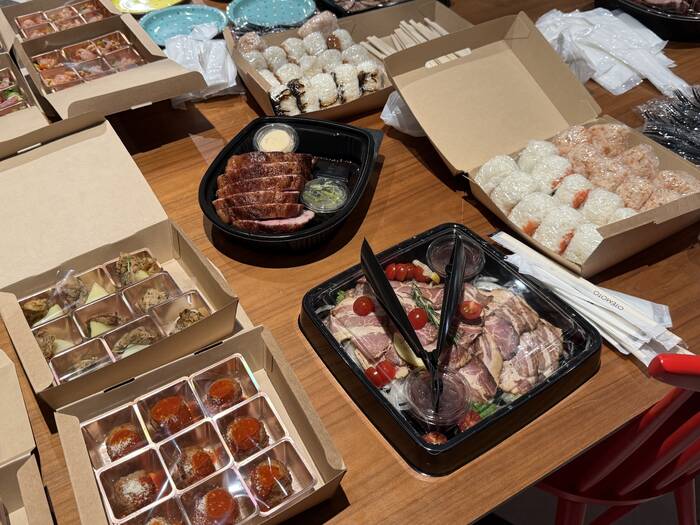 メンバーからはおにぎりがとてもいいというコメントを複数いただきました。写真の通り、おにぎり+お肉+オードブルの組み合わせで、目もおなかも満たすことができました。配達もスムーズで早めに来てくださったおかげで助かりました。お忙しいところ丁寧にご対応いただきましてありがとうございました。 -