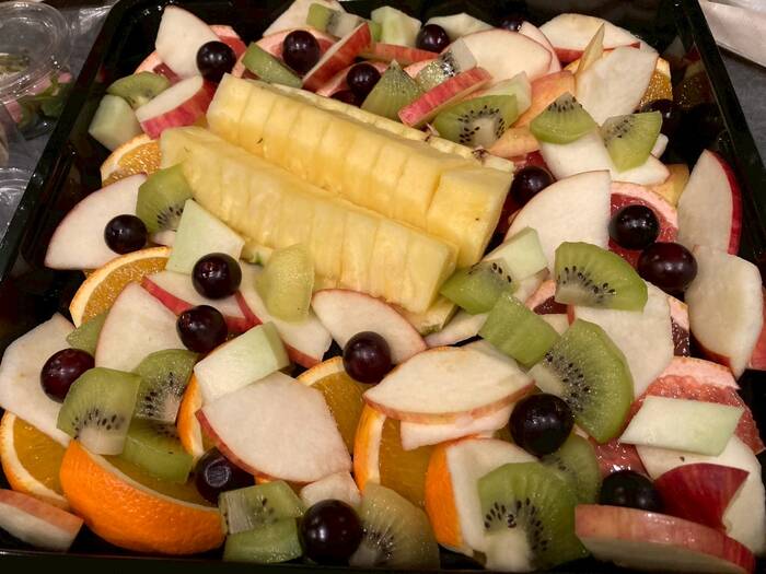 サラダやチキン、パスタ、フリッター、フルーツなどバランスが良く盛り付けもおしゃれです。個別にカップと取り分けのものがミックスであるのも良かったです。