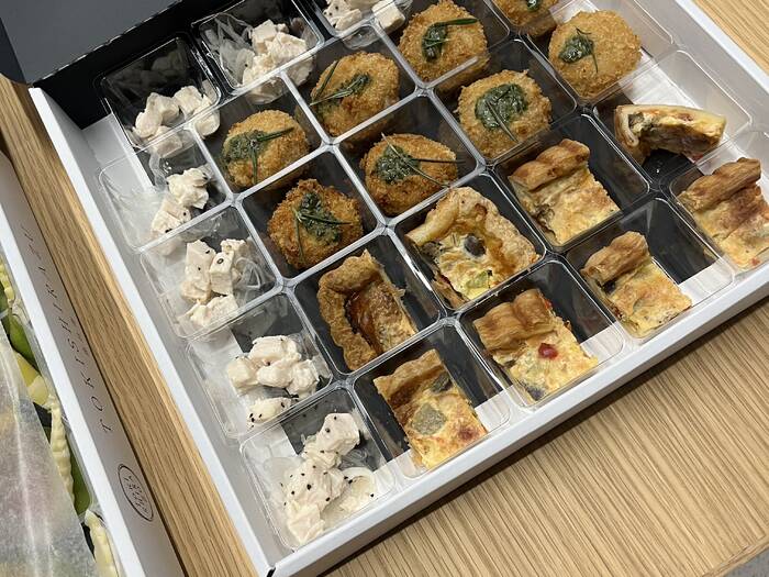 研修後懇親会で利用しました。いつも頼んでいるところと違う料理を探しており、こちらに決めました。箱がかわいく、料理の見た目もおしゃれかつ立食で分けやすいので、利用してよかったです!