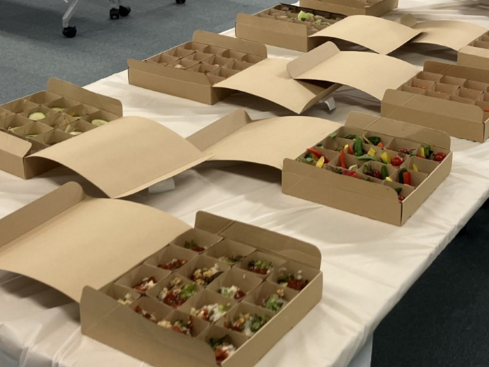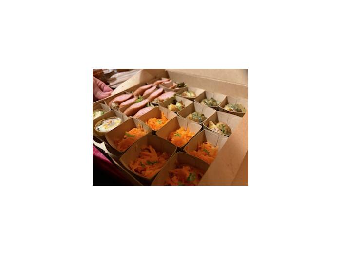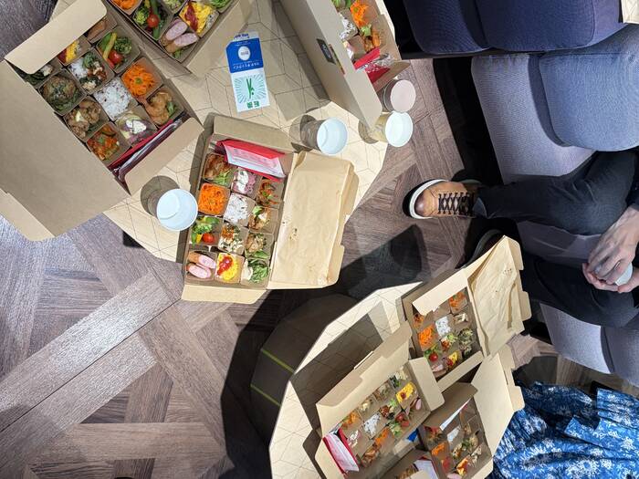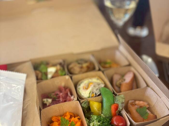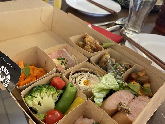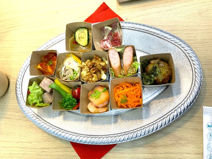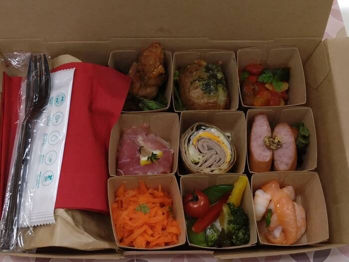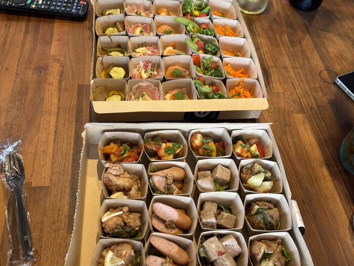 今回会社のイベントでの利用検討のため事前に関係者の試食を兼ねてオーダーさせていただきました。BOX型(お弁当のような形になるもの)ではなく、一人一品ずつ自分で取ってお皿に乗せるスタイルの方がイベント感が出ると思い、一品のサイズ感や11品でボリュームが足りるかを知りたくてオーダーしました。一品がすごく少ないかなと思ったのですが、多くの味を楽しめるので、一品の少なさはあまり感じず、11品でもボリュームとしては問題ないと感じました。味付けが、立食でお酒を提供するようなパーティーに向いているような少ししっかりとした味だったので、これは夜にお酒の提供も合わせるスタイルが良さそうだなと思いました。味やサイズ感、見た目のいろどりなどとても良いです。