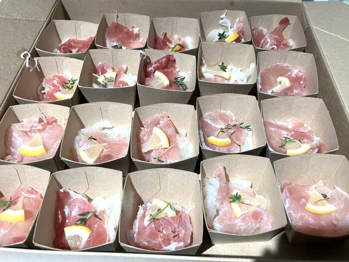 立食でワインと軽食の用意ということで、こちらをインターネットで見つけまして、ドキドキしながらの依頼でした。1人ワンボックスという形ではなく、立食でのおつまみ用と気付き20名分を注文し、最初は数名で座っていましたが夕方から一気に混みだしてきて立食となり、つまみやすく、ちょうどいいボリューム感でしたし、お皿の用意やナプキンもあり特に不要で助かりました。(20名分のナプキンとフォークでしたので、後はこちらで用意しました)
