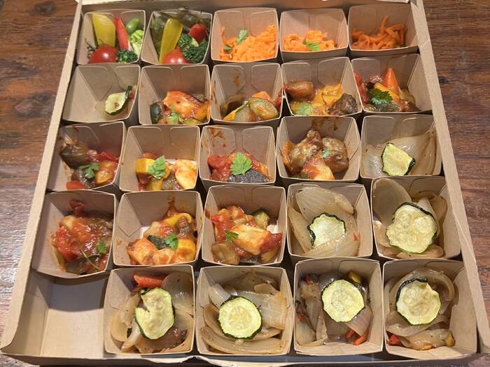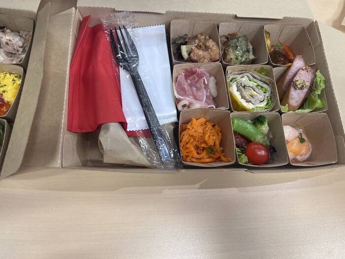 会議室での社内打ち上げにて利用させていただきました。立食式で行ったため、取りやすく、食べやすく、かつデザートも付いていればと探していたところ見つけました。かわいらしい紙カップに小分けされたお料理は美味しく、おつまみにもなりました。お野菜も豊富で内容は良かったです。また、廃棄しやすいように紙製品が使われていたのも助かりました。デリバリーも指定時間の最も早時刻に到着、遅延は有りませんでした。条件に見合ったケータリングで、フォークやおしぼりのサービスも嬉しかったです。