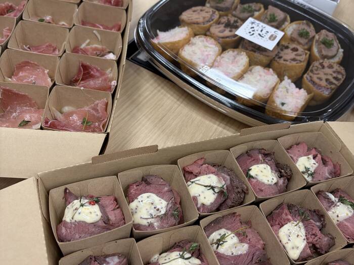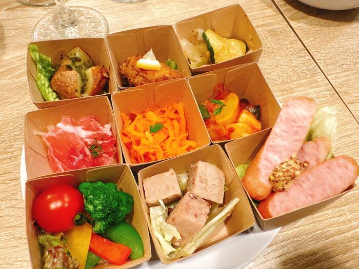 彩の良い食材が揃えられていて、パーティーに花を添えてくれます。小分けになっていると食べやすいこと、人数変更があった場合にも対応できる点が重宝します。
