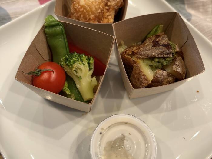色んな食材がカラフルに盛り付けられ、1つ1つが小分けのカップに入っており、可愛く、食べやすく、配布しやすい便利なセッティングになっていました。少し残念だったことは、バーニャカウダのソースと野菜が別々になっていて、パーティーのようなシチュエーションだと、ソースが野菜用と認識されないまま、味の付いてない野菜を食べてしまう人が多かった点です。ソースだけ箱に入っていなかったので、ひっくり返って漏れていた物もあり、人数分行き渡らなかったのも原因かと思います。せっかくなので、野菜の中にソースを最初から入れて頂いた方が良いかと思います。