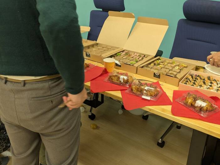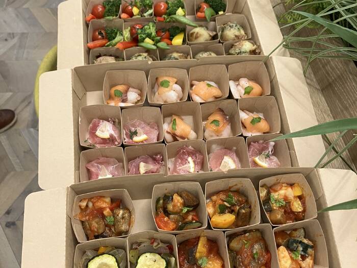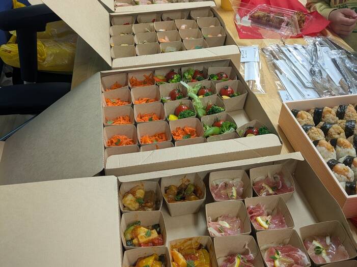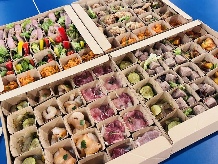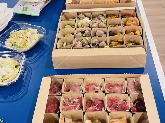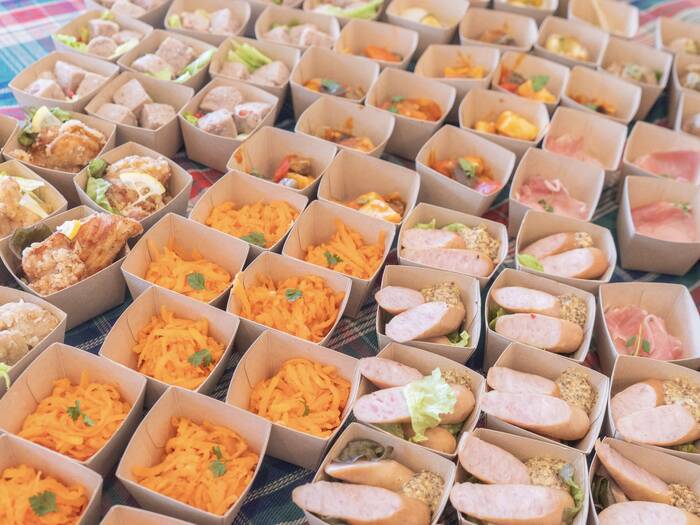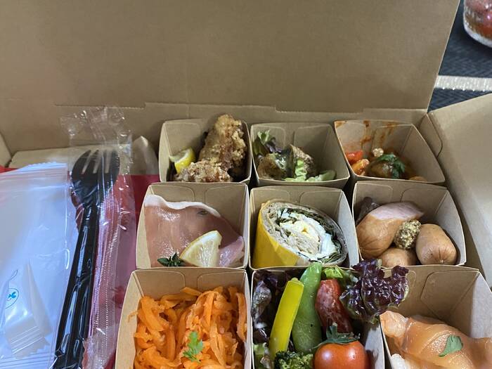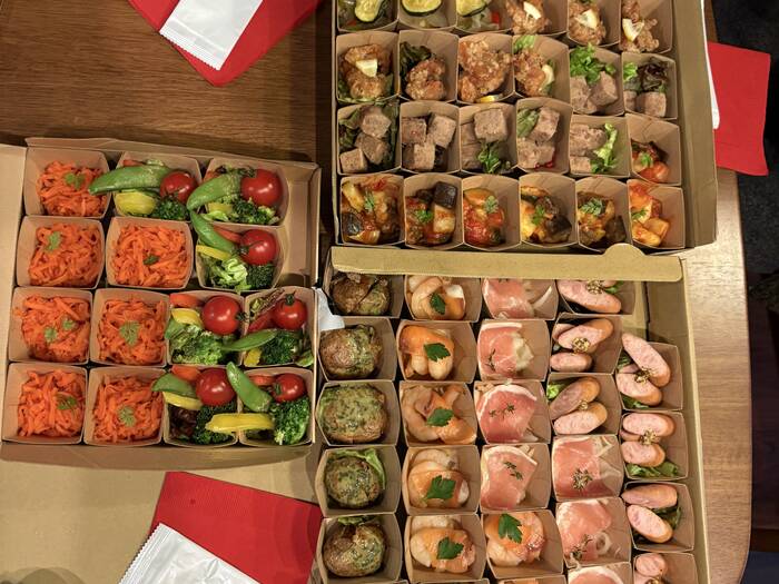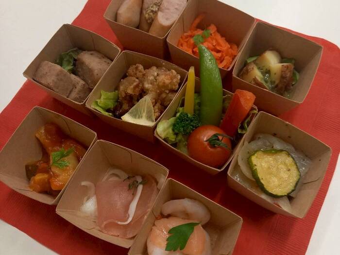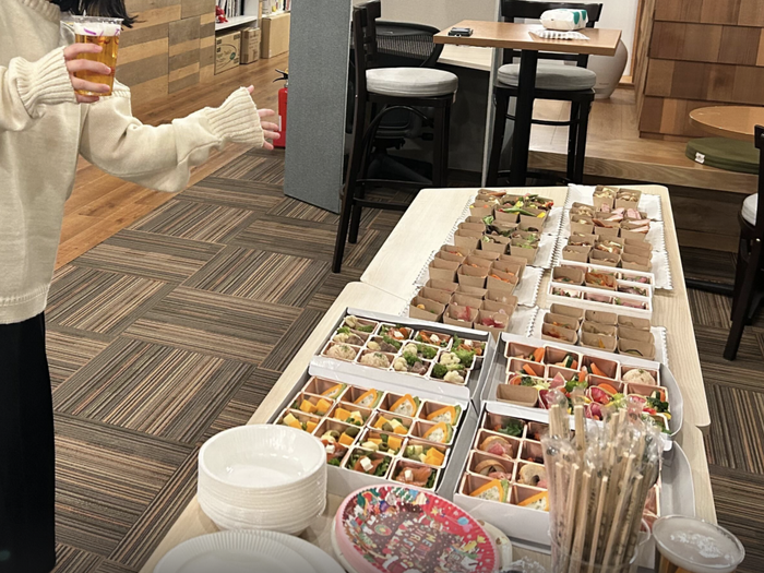 一人1500円で10種類、カラフルで味も美味しく、カップを一つずつ順番に取っていくだけでもパーティらしくなり、みんなテンションが上がりました!取り分けなくて良いので気を使わず、ゴミも少なかったです。欲を言えば、10種類のカップが乗る紙皿がついていると嬉しいではし。