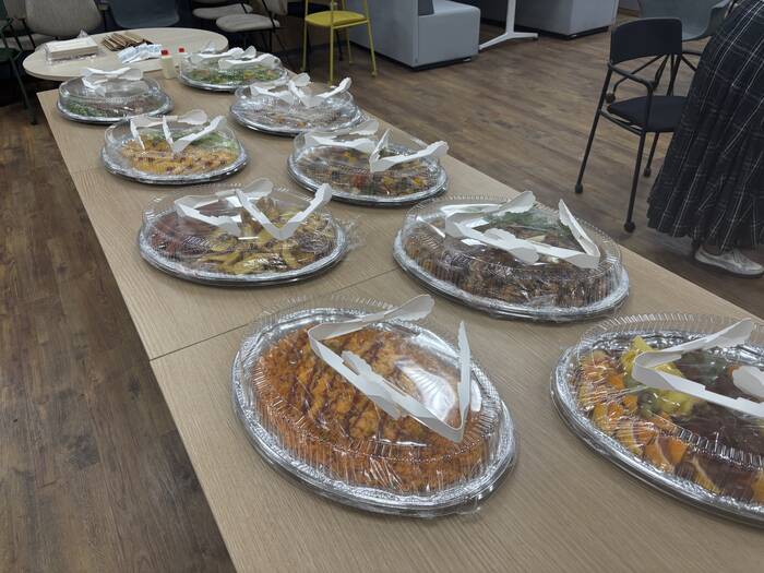 料理はどれもボリューム満点で満足感があり、カップ入りや串に刺さったメニューなど、手をあまり汚さずに気軽に取れる工夫がされていました。立食でも食べやすく、参加者それぞれが自由に楽しめる雰囲気で、とても良かったです。