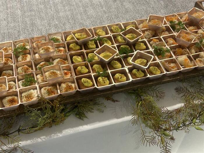 小分けカップが折箱に入った5つのブッフェプラン。少人数でお楽しみいただけるレストランスタイル個食プランを4プランご用意しました。また黒毛和牛の赤ワイン味噌煮込みは温かくお召し上がりいただける加熱容器でお一人ずつご提供。団体向けブッフェプランは高級感ある竹のオリジナル折箱でお届けいたします。