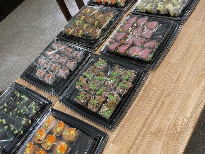 会議室での懇親会で利用しました。お寿司を注文したくて、こちらのケータリングを選びました。和食のケータリングは初めてで、ヒジキなど見た目は少し暗いかと思いましたが、おいしかったです。すき焼きが早い者勝ちになりました。お寿司もおいしかったです。