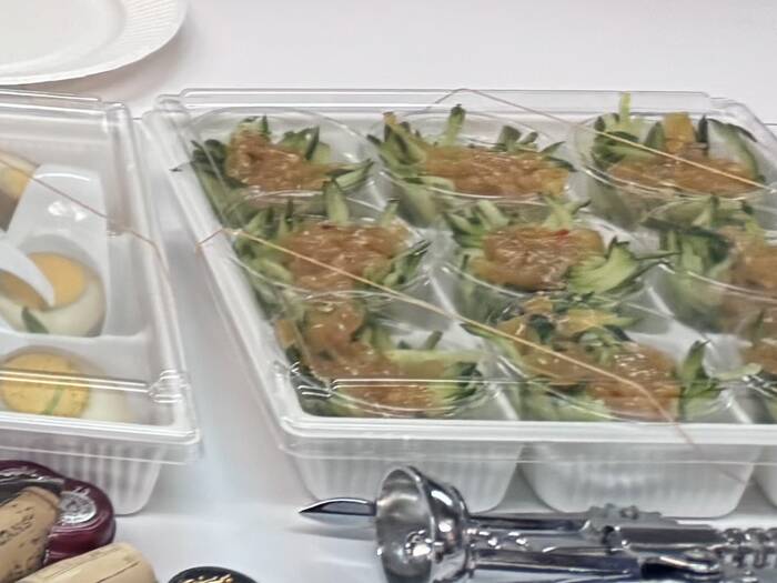 参加数50名(外国人含)男女比1:4程度の状況。一年間の慰労を込めて楽しくて、ちょいかっこ良さげをかもし出したかった思惑です。買出しや配膳の手間はとれなかったため、大変「お届け」は助かりました。実際に狙い通り雰囲気は好評でした。味的には今一つでしょうか。取りやすくひとつづつとれる配慮は案外よかったようです。ちなみに、洋食・中華はシェフコレ利用。和食はお寿司にしてます。テーブルに満ち溢れたもり付けたなか、「中華」一番喜ばれたようです。なお、時間に若干おくれた配達でしたが、配送の人は丁寧でした。今後も考えたいです。