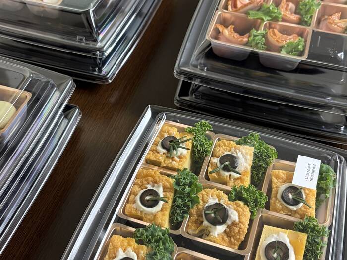 料理は小分けになっており一つ一つ別容器なので、立食形式で席移動がある場面でも各自パッと皿に取りやすく便利でした。
