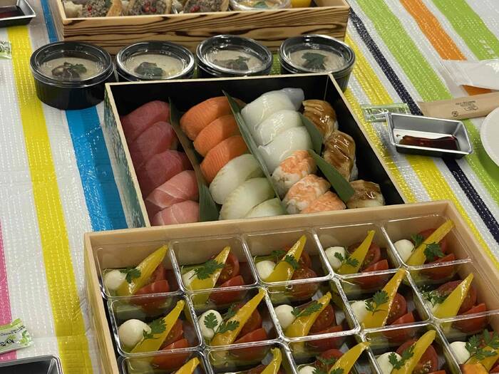 職場の新人歓迎昼食会(20人)で利用させていただきました。彩り豊かな料理が美しく並んで見た目の華やかさがあったので、食事会の雰囲気づくりにも一役買ってくれました。料理が一つひとつ小分けになっているので非常に食べやすく、参加者同士で取り分ける手間がなくスムーズに食事を楽しめました。お寿司とローストビーフや彩り野菜などの洋風オードブルのコンビネーションで、味のバランスも良いと思いました。参加者にナッツ・アレルギーの方がいたので、あらかじめナッツの含有について確認したところ、丁寧に回答をいただきました。安心してオーダーできるコースです。