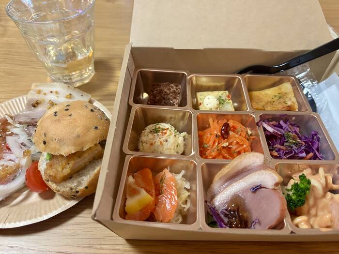 お料理の彩りもきれいで、その色鮮やかを際立たせる紙皿やパッケージ。