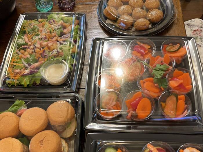 料理の見栄えが良く、当日並べる側から家族がつまみ食いを始めました❗️ 量はちょうどお腹がいっぱいになるくらいかな❗️中でもミニハンバーガーが人気で、私はチキンとサラダが美味しかったです。マリネの酢味が気持ち薄目に感じましたが、家族は美味しかったようです。配達の包装も綺麗で、入れ物やサービスの紙皿なども良かったです。配達時間もピッタリでした。前日も同窓会幹事で、他店のオードブルを頼みましたが、絶対こちらにすれば良かった?と思いました。AKITOさんお世話になりました。またお願いします。