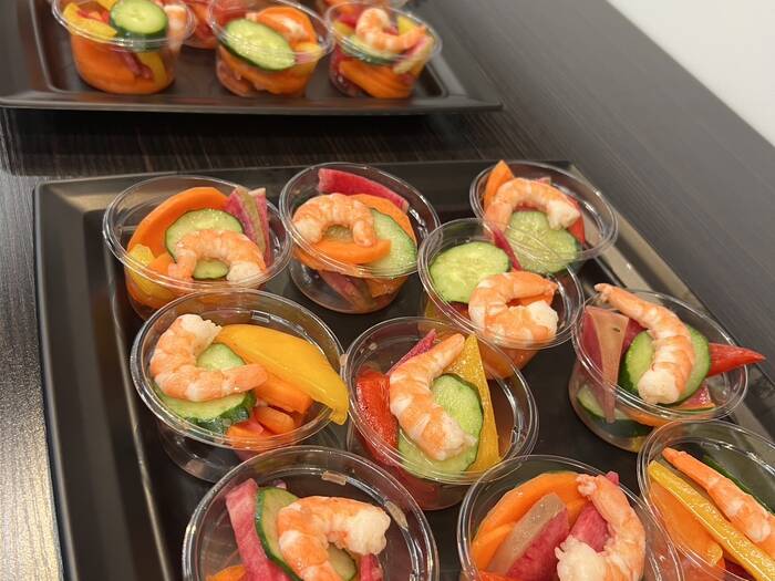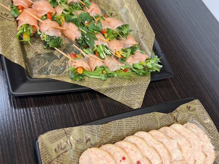 それぞれの料理がトレイ上にも小分けされていて、最後皆さんに残さず食べていただくように、トレイごと各テーブルを回って、配りました。お陰様でフードロスする事無く食べきれました。