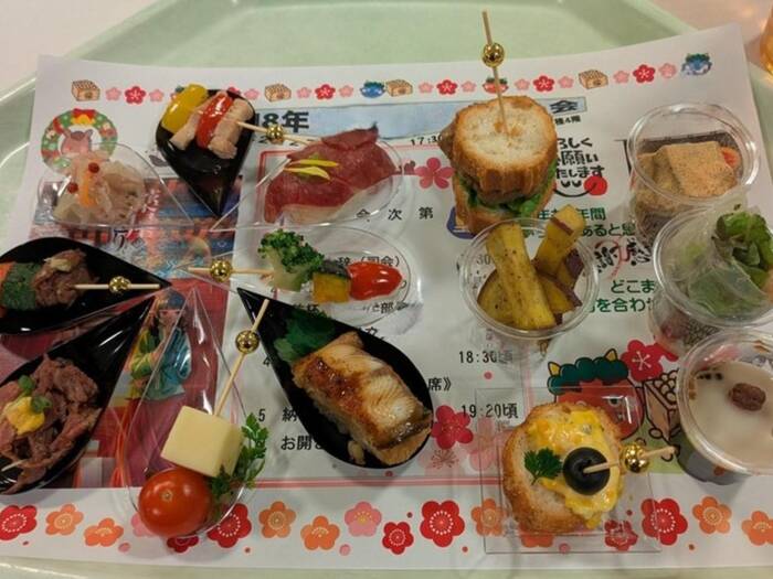 お寿司2種、お肉2種が見た目にもボリュームがあり、またその他のオードブルを含め味が良く、参加者の皆さんからも”満足”のコメントをいただきました。