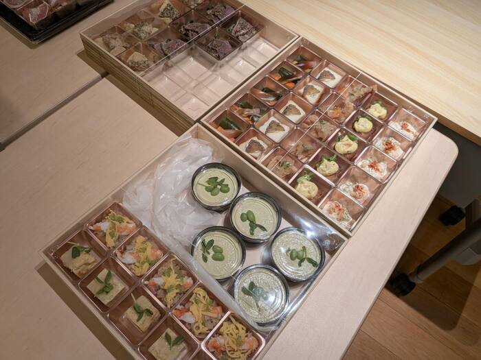 お肉に偏ることもなく、バランスが良いため、あまりに重くならない料理が好まれる場合はよいかと思いました。一方で小分け料理をまとめている容器が少々小柄なため、見栄えをよくするためには工夫して並べる必要があるように感じました。容器自体はしっかりしており、人数ごとにセットを作ってから自席に持って帰ってもらうときに適した容器に感じました。