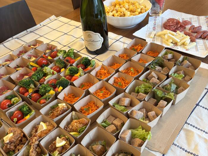 ひとり分ずつの小分けになっているので、手に取ってもらいやすく、取り分け不要で片付けもラクで助かりました。彩りあざやか