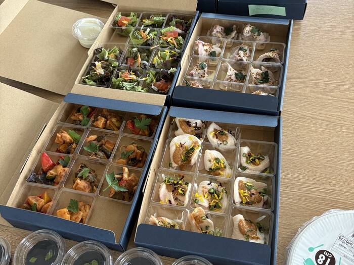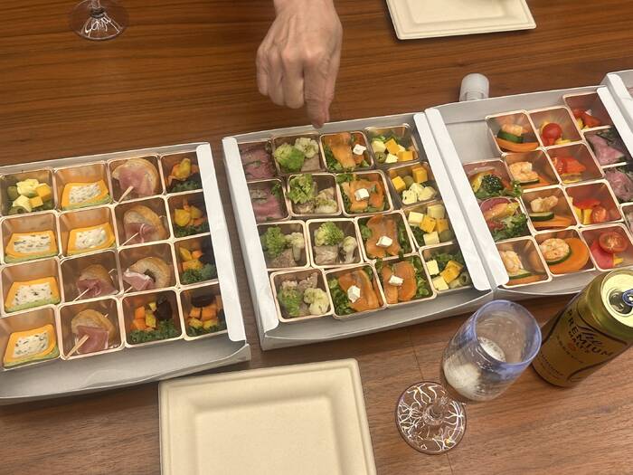 余りに貧相に見えてしまう為、食べる前に4皿を2皿にまとめて提供しました。懇親会で気軽に使える