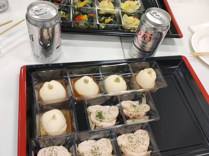 届いたときは、一つの箱に同じお料理が入っています。着席スタイルだったため、席を移動しなくても色々なものが食べられるように詰め替え作業をしました。参加者の年齢層的にボリュームが多かったです。