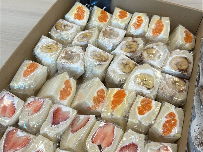 海外からゲストが来ており、社内で立食懇親ランチを開催した際に利用させていただきました。他のお店で用意したサンドイッチが肉系でしたので、こちらのフルーツサンドを追加しました。クリームが甘すぎず、特にバナナが好評でした。個包装されており少し開けにくかったのですが、パンがパサつかないのがよかったです。