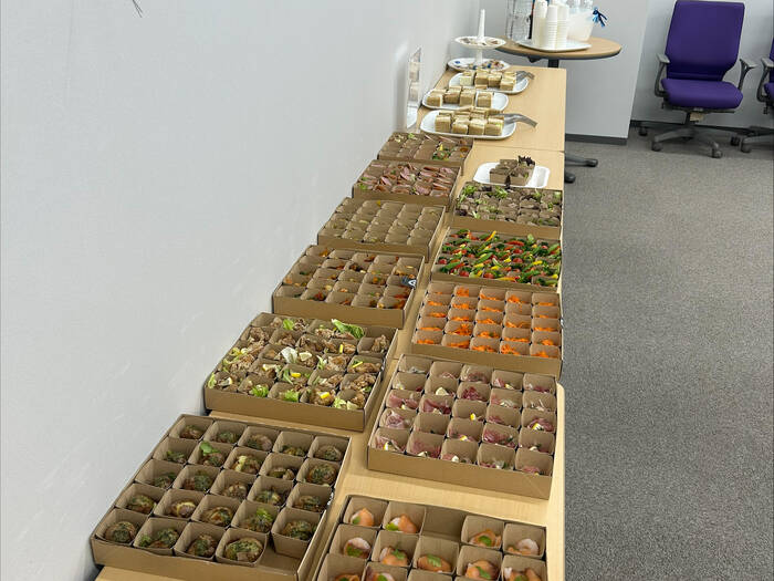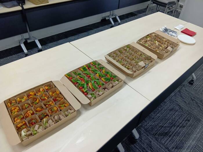 外国からの参加者、30名近くてサッと手で取れるし、目でもすごく楽しめました。味ですが、数人から胸やけがするという事で、脂がちょっと古いのかなと感じてしまいました。そのため料理・味は星をマイナス1個。配達の方も本当に感じの良い方でした。四角いプレートを用意してちょうど良い感じに個別のカップが収まってました。