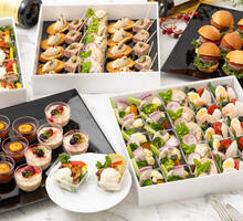 【レストランのパーティ料理を楽しめる】が当店のコンセプト。前菜からメイン、デザートまで。手がこんだ本格フレンチのフルコースを高級感ある折箱に小分けカップでお届けします。また温製のお料理やジビエ、自家製バンズのスライダー、自家製スイーツの盛り合わせなどをパーティシーンで喜ばれるお料理の数々を彩りよく、盛り付けました。
