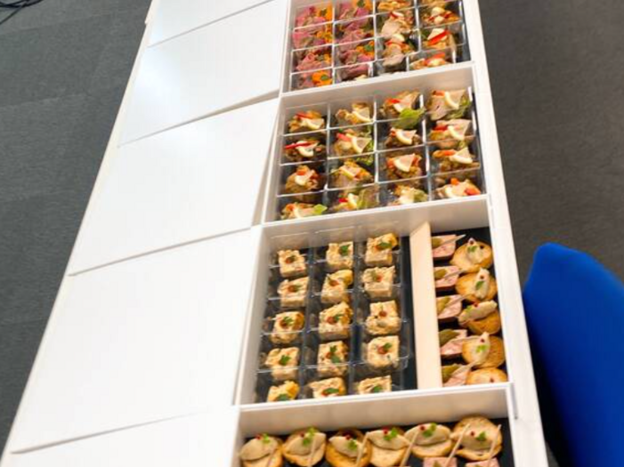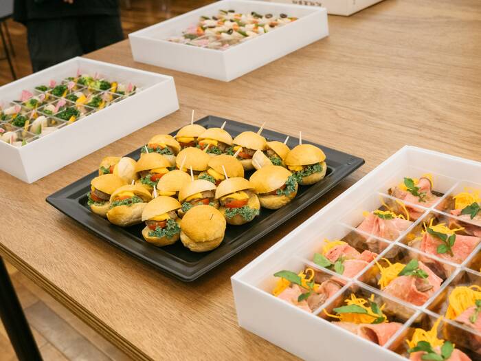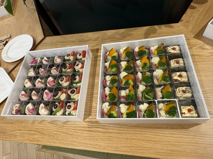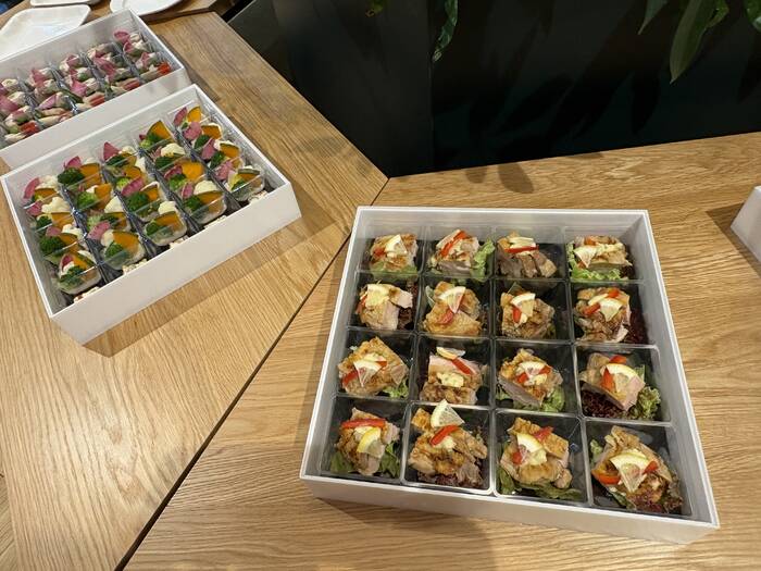 イベントの懇親会で利用させていただきました。立食スタイルにしようと思っていたのですが、イベントのアジェンダが変更になり、ごはんを食べながらのセッションになってしまいました。しかし、小分けで手に取りやすいスタイルであったこともあり柔軟な対応ができました。