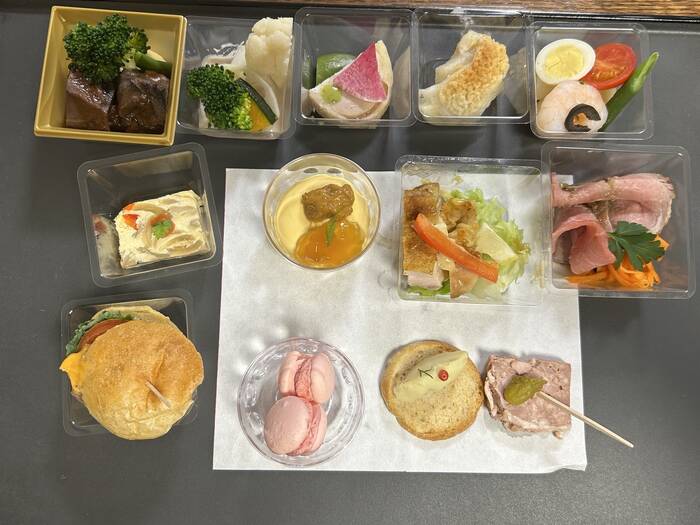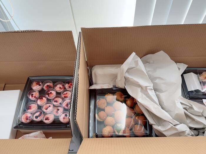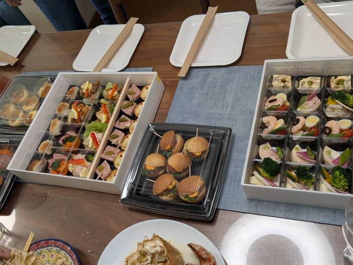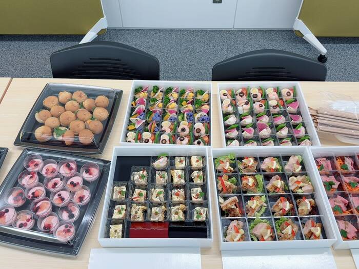 料理がカップに入っていたり、一口サイズに取り分けられていたりと工夫されており、会話をしながらでも非常に食べやすかったです。取り皿やお箸で手が塞がらないので、参加者からも好評でした。