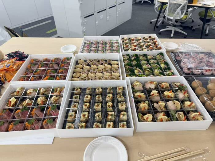 今回注文したメニューは、一口サイズのミニバーガーや、小分けにされたローストビーフ、彩り豊かなデリなど、視覚的にも非常に楽しめる内容です。会議の疲れが少し和らぎ、和やかな雰囲気で食事を始めることができました。