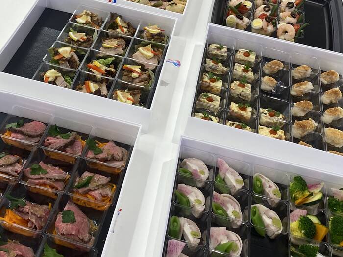 彩り豊かで手に取りやすいフィンガーフードでした。お肉から野菜まで多様なメニューで参加された方の好みに合わせて食べていただけました。小分けしてあるため、立食でも食べやすかったです。
