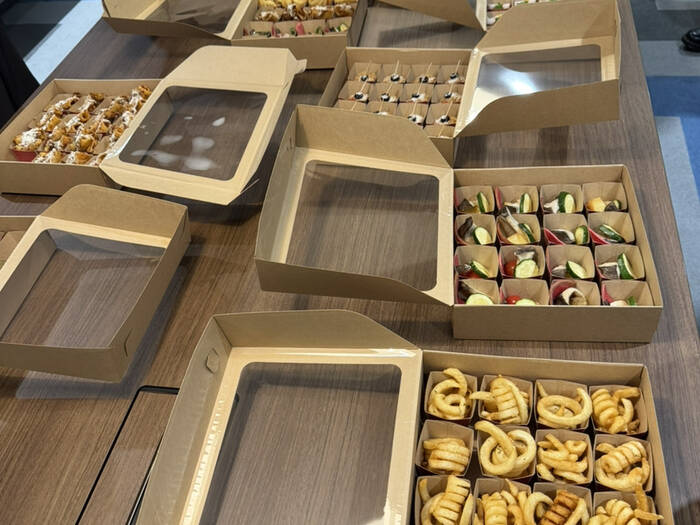 プロジェクトメンバーの懇親会で利用しました。小分けにした入れ物が非常に手に取りやすくて持ちやすく料理をおいしくいただきました。お寿司が大人気で直ぐになくなってしまいましたが、ボリューム的にはちょうどよかったと思います。また機会があればぜひ利用させていただきます。