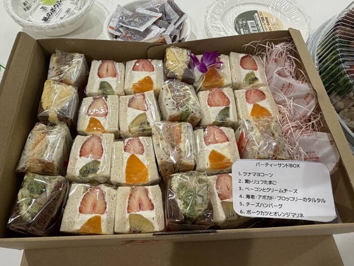 今ちょっとしたブームと言っても過言ではないフルーツサンド。「さくらサンド」では、厳選した季節のフルーツに、口どけのいいクリームをたっぷりとサンド。フルーツの断面がカラフルで可愛らしい仕上がりになっています。食べやすいサイズ、個包装にてお届け。パーティーにはもちろん、ティータイム、リフレッシュメントなど幅広くご利用くださいませ。
