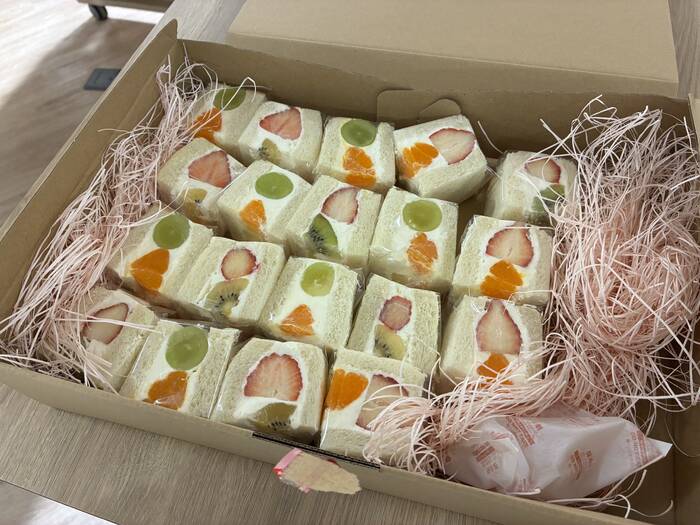 クリスマスパーティでサクラサンドのフルーツサンドを頼みました。指定した場所まで丁寧に届けて頂きました。また、フルーツということもあり、冷蔵の袋に詰めた状態で持ってきてくれました!なにより、フルーツのバリエーションも多く美味しかったです。また、機会があったら頼みたいです。