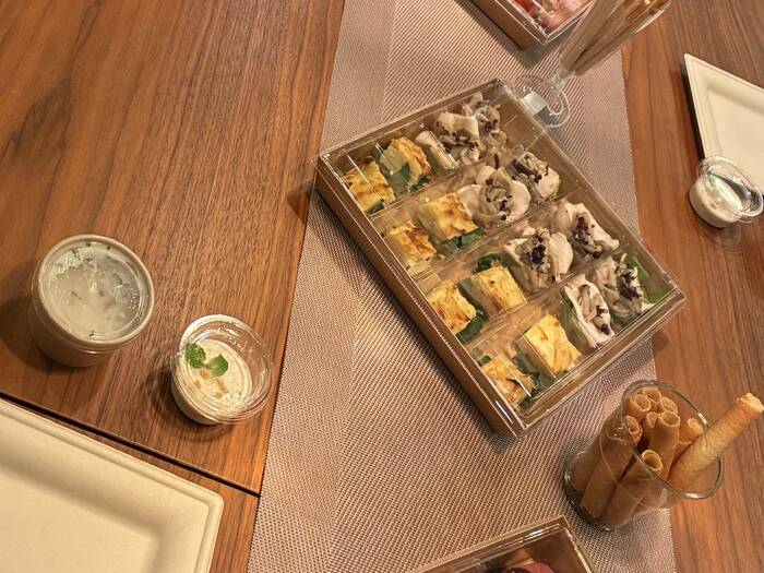 デザートの紅茶のブランマンジェまで付いていて、最後まで満足感あり。使い捨て容器でのデリバリーですが、取り皿・割箸・おしぼり・デザートスプーンまで付いていたので、社内開催でも準備が最小限で済みました。コスパも良く、また社内イベントで利用したいです。 -