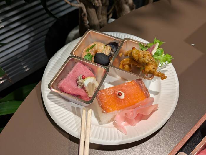 ムール貝も厚みがあり、押し寿司のボリュームも食べ応え充分、デザートの