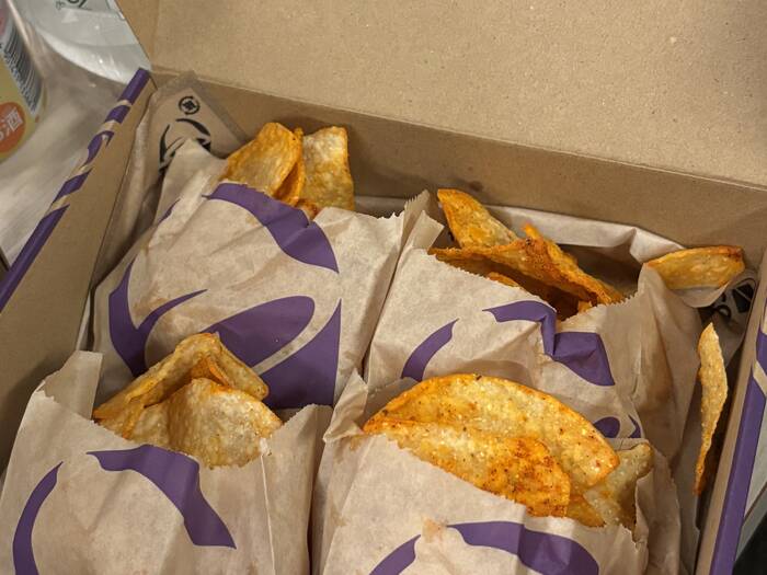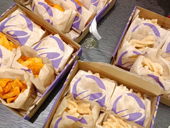 タコベルさんは、シェフコレ以外で食べたことがあったので、注文してみました。会議後(17:30~)の懇親会で利用したのですが、人数は8名、2300円/人のセットを注文しました。味はとても美味しかったです。味だけならリピ確定です。ただ、マイナス点といえば、まずボリュームが少なかったこと。また、ボリュームが少なかったに繋がるのですが、8種類のセットのうち、チップス(ナチョとシナモン)が2種類と、チョコディーヤ、グリルドチーズサンドの4種類がボリュームがないので、足りなかったというのが本音になります。このセットに、この四種類は不要かな、せめてこのうち2種類かな、という感じでした。最初にプラン内容を見て、自前でサラダを準備しておいたので良かったと思いました。