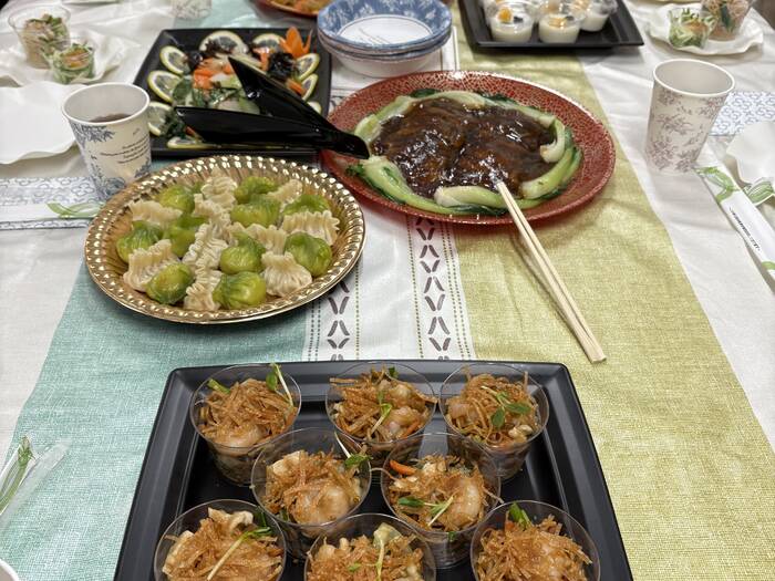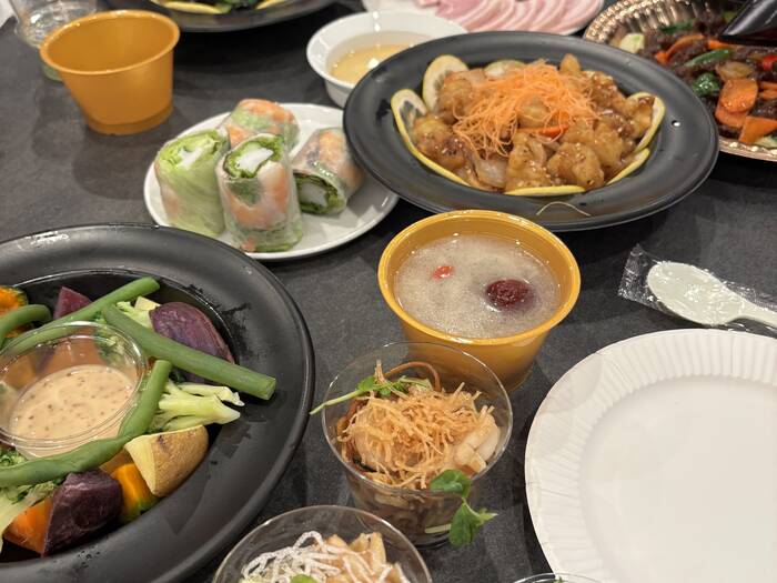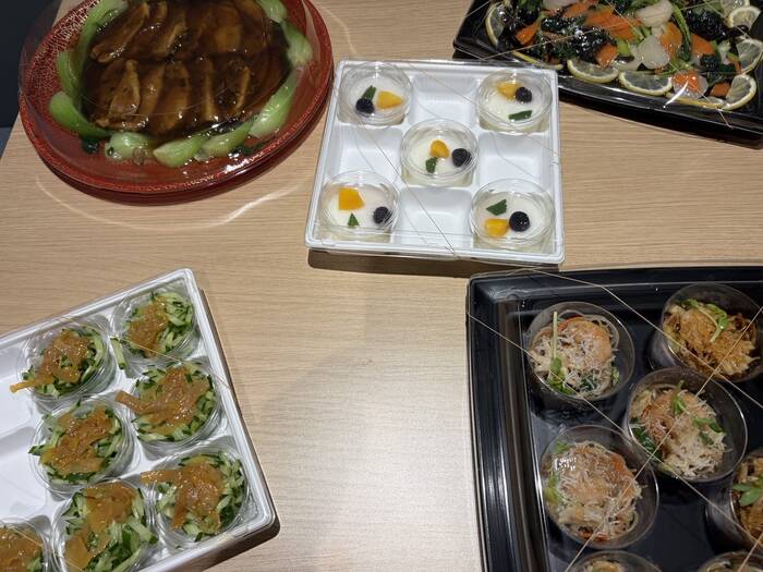 大変華やかな見た目で、参加者からも評判が良く、喜んでいただけました。味は、甘過ぎたり衣だけで中身が確認できなかったり、、、と色々ありましたが全体的にはお値段以上のものを届けていただいたと思います。この値段で小さなデザートまで付いているので、こちらを注文するだけで会は完結します。ただし、温かいまま届くということはありませんので、サイズ的に電子レンジに入らなかったものは諦めました。紙皿が付いているとのことでしたが、大皿が多いので普通サイズの紙皿が人数分しかなく足りなかったため、自力での準備が必要です。領収書の受領で別の団体のものが手元に来てしまうというトラブルはありましたが、迅速に対応していただけました。