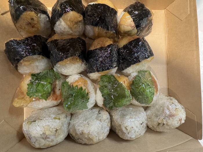 当店の天むすは様々なバリエーションをご用意しております。天ぷらの種類もエビ天やとり天といった定番のものから、かぼちゃ天やごぼう天といった野菜の天ぷらも。また、リーズナブルに楽しめる天かすを使った混ぜ込みおにぎりもございます。昼食やリフレッシュメントの軽食、パーティーの主食など、シチュエーションに合わせてご賞味ください。