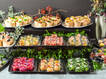 【温製】ステーキハウスのビーフピラフ / 【温製】四川風エビのチリソース / 【温製】白身魚の香草グリル / ローストビーフ / スペイン産生ハム「ハモンセラーノ」 / パテ・ド・カンパーニュ / ハーブグリルチキン〜マスタードソース〜 / マッシュルームリゾットのライスコロッケ / エビとイカの冷製マリネ / イタリア風オムレツ〜フリッタータ〜 / 紫キャベツとニンジンのラペ / ダブルベリーのケーキ