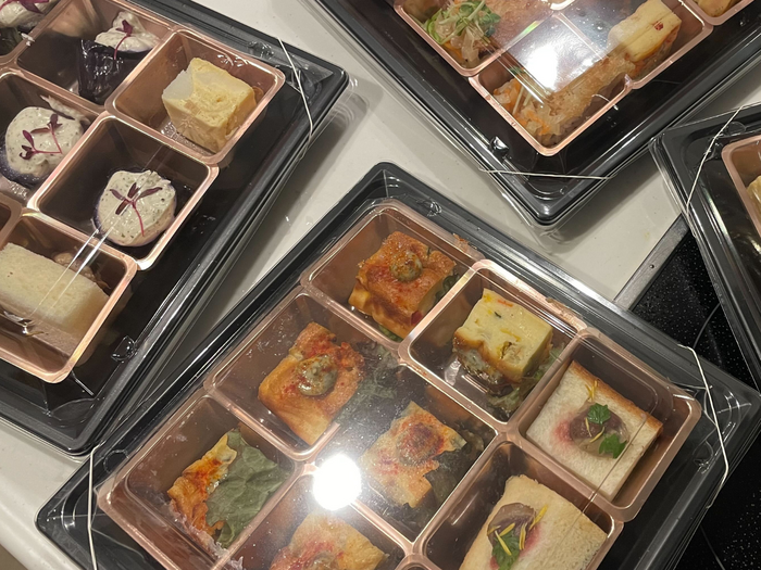 9皿ずつ入る蓋付のお洒落な容器の中に、小分けカップに入れ、取り分けしやすいオードブルプランをご用意しました。ひとつひとつのお料理はシェフ渾身の冷めても美味しいオードブルの数々です。目でも舌でも楽しんでいただけるお料理でパーティを演出していただけます。