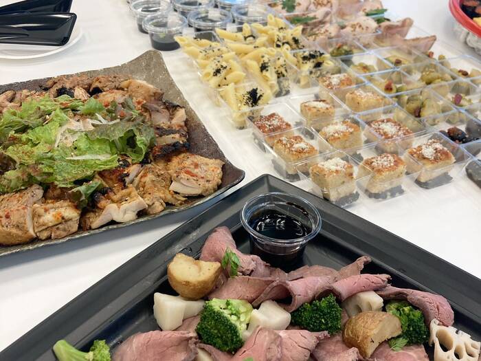 小分けで届くスタイルは配りやすく衛生的で、参加者からも好評でした。炭火焼きの香ばしさが際立つローストビーフとポークは柔らかくジューシーで、シェフの手仕込み感が伝わる味わいでした。和洋創作のバランスも良く、デザートまで満足感のある内容で、懇親会を華やかにしてくれるプランでした。